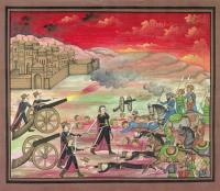 Photograph of a Silk Painting commissioned by Miles Macnair and created by an Udiapur Art School. It depicts 2nd Lt. Jimmy Hills of the Bengal Horse Artillery winning his V.C. on a ridge outside Delhi in 1857 during the Siege of that City.