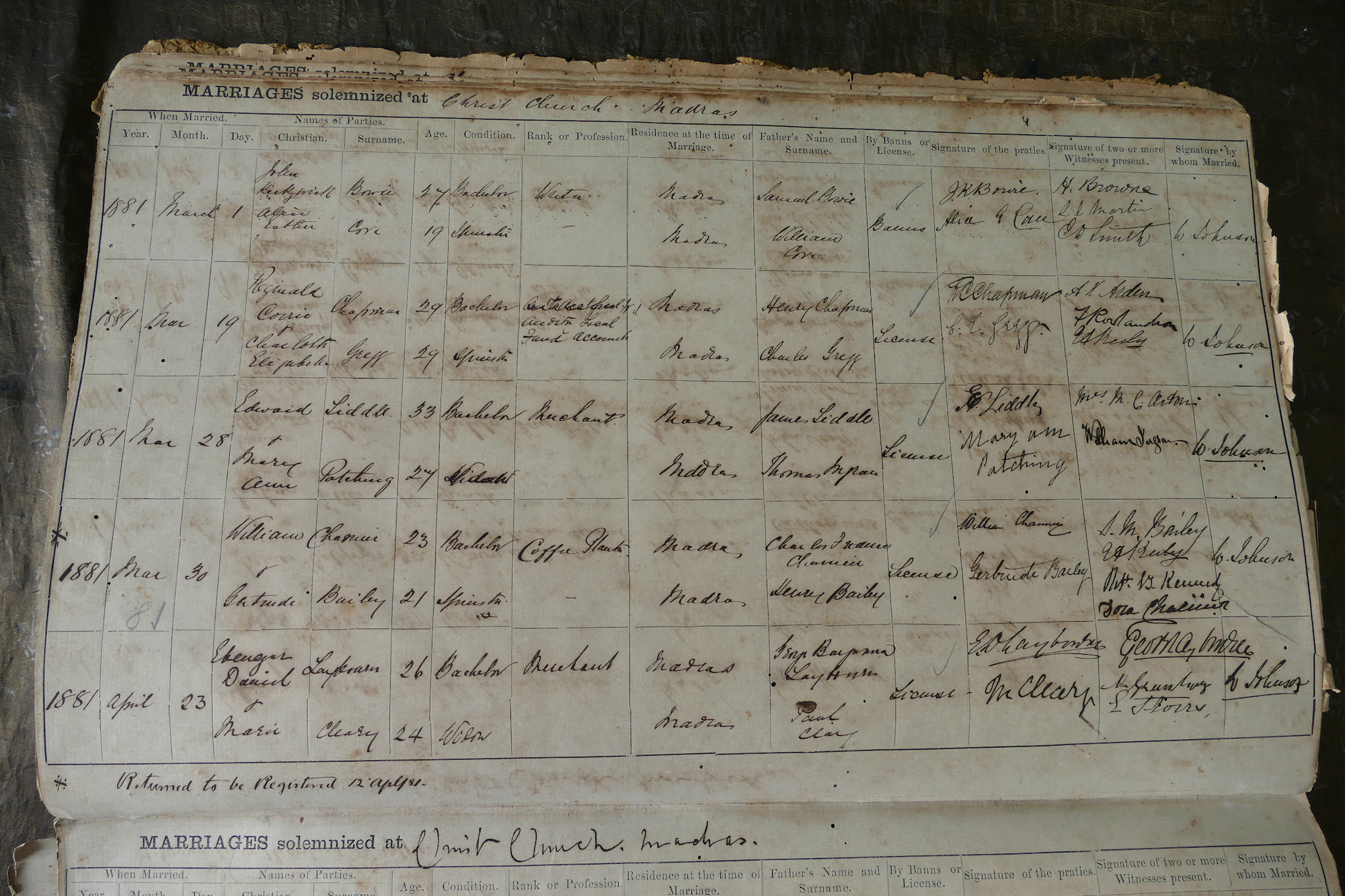 Christ Church, Mount Rd Madras - Marriage Register