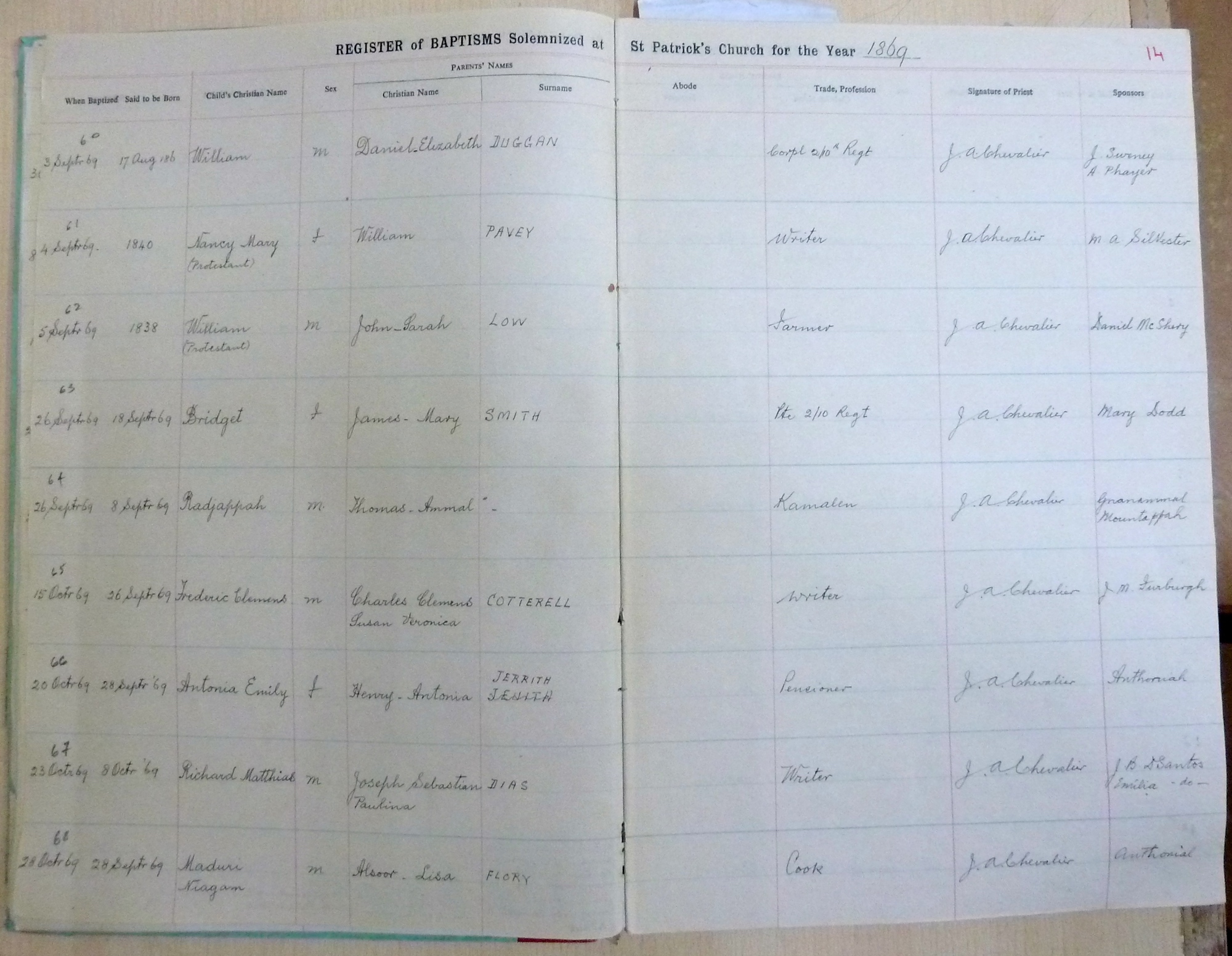 Image title: St Patricks Church, Bangalore Register of Baptisms 1868 to 1898 - page 14 File size: 931,869 bytes