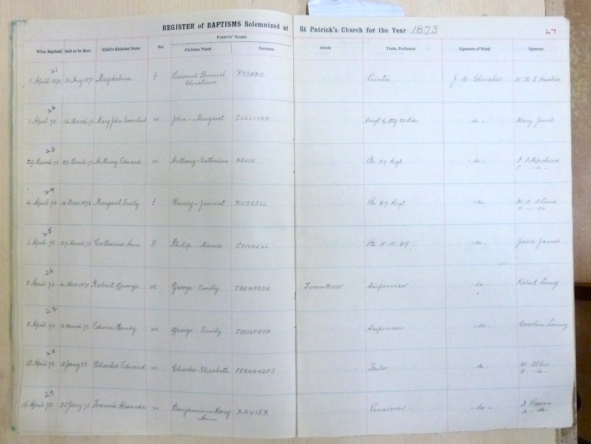Image title: St Patricks Church, Bangalore Register of Baptisms 1868 to 1898 - page 47 File size: 863,166 bytes