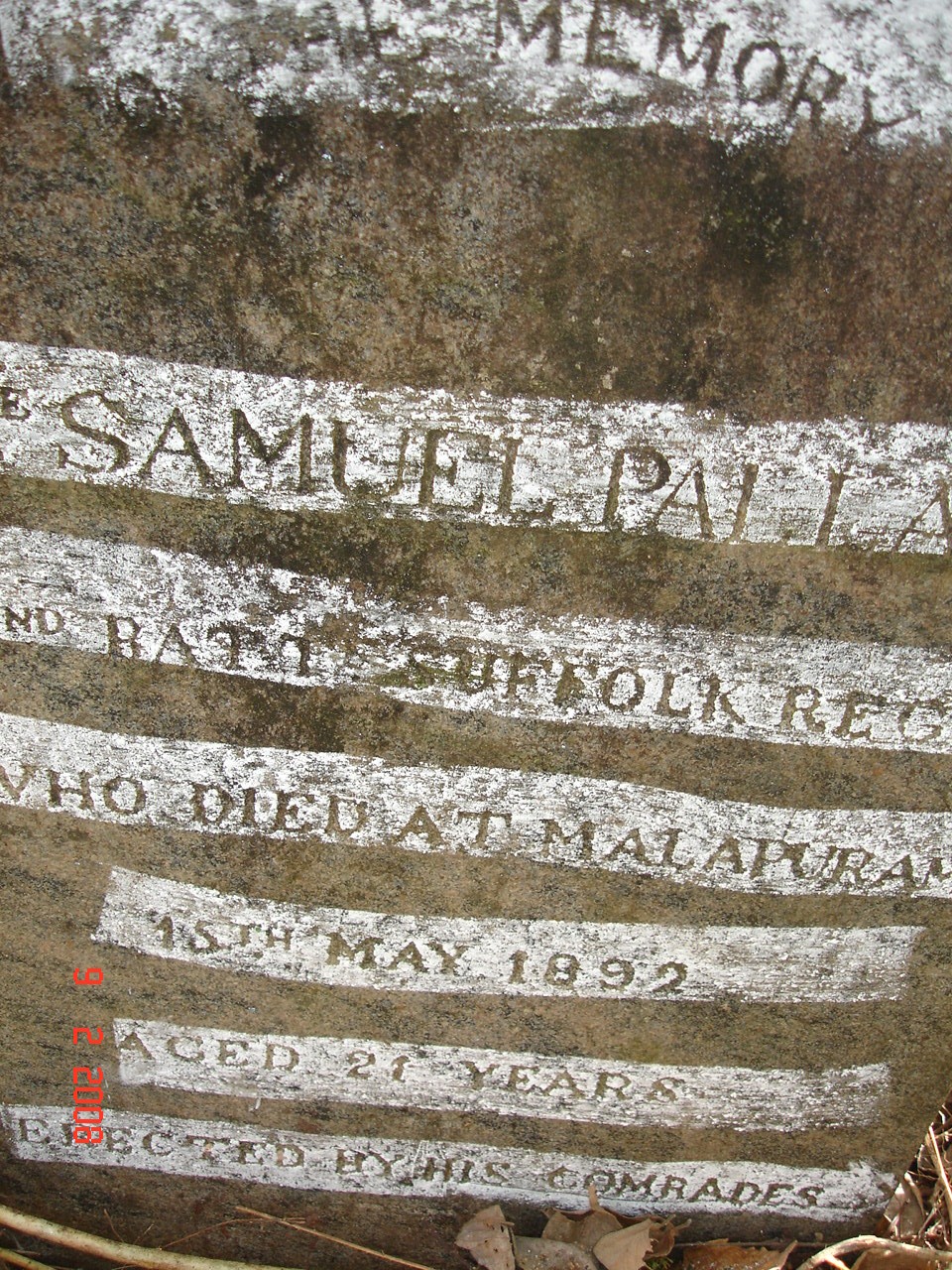Inscription Reads: Samuel Pall(ant) 2nd Battn. Suffolk Regt. who died at Malapuram 15 May 1892 Aged 21 years Erected by his Comrades