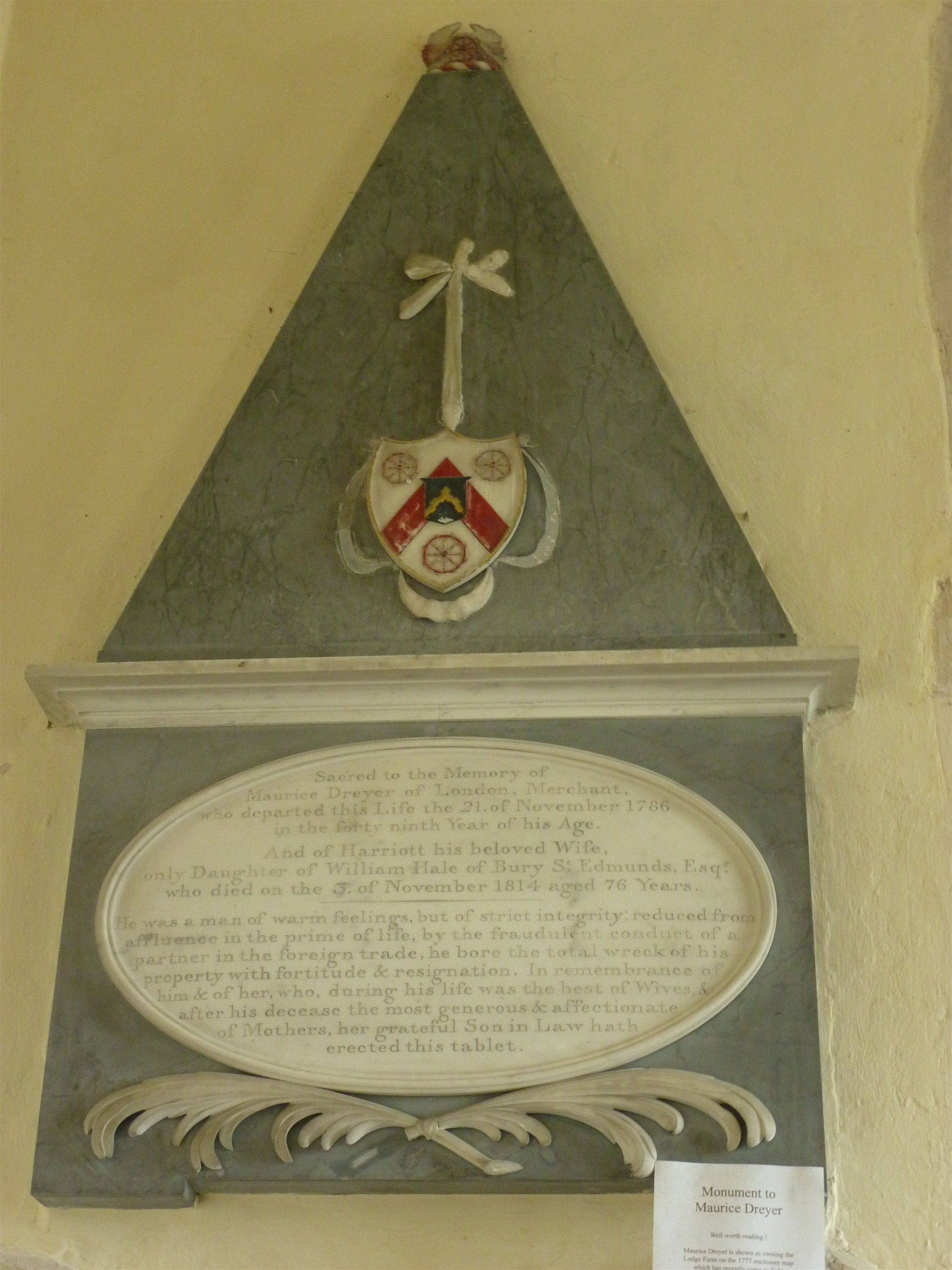 Sacred to the Memory of Maurice Dreyer of London, Merchant, who departed this life the 21st November 1786 in the 59th year of his age. And of Harriott, his beloved wife, only daughter of William Hale of Bury St. Edmunds, Esq., who died on the 3 of November 1814, aged 76 years. He was a man of warm feelings, but of strict integrity, reduced from affluence in the prime of life, by the fraudulent conduct of a partner in the foreign trade, he bore the total wreck of his property with fortitude and resignation. In remembrance of him & her, who, during his life was the best of wives & of mothers, her grateful son in law hath erected this tablet. -ooOoo- Extracted from notes in the church: Maurice Dreyer Was the son of John Daniel Dreyer Snr. and brother of John Daniel Dreyer Jnr. John Senior (? 1762) was a Flemish Merchant of Amsterdam who became naturalized English in 1754. He had significant dealings with the East India Company and lived in Jeffers Square, then in Muscovy Court, Tower Hill in London. He was associated with two colleagues (relations?): *Matthew Decker (1679-1749) a Chairman and Director of the East India Company *Gerard Van Neck (1691-1750), naturalized English in 1719, also a Director of the Eat India Company (1729-1731)