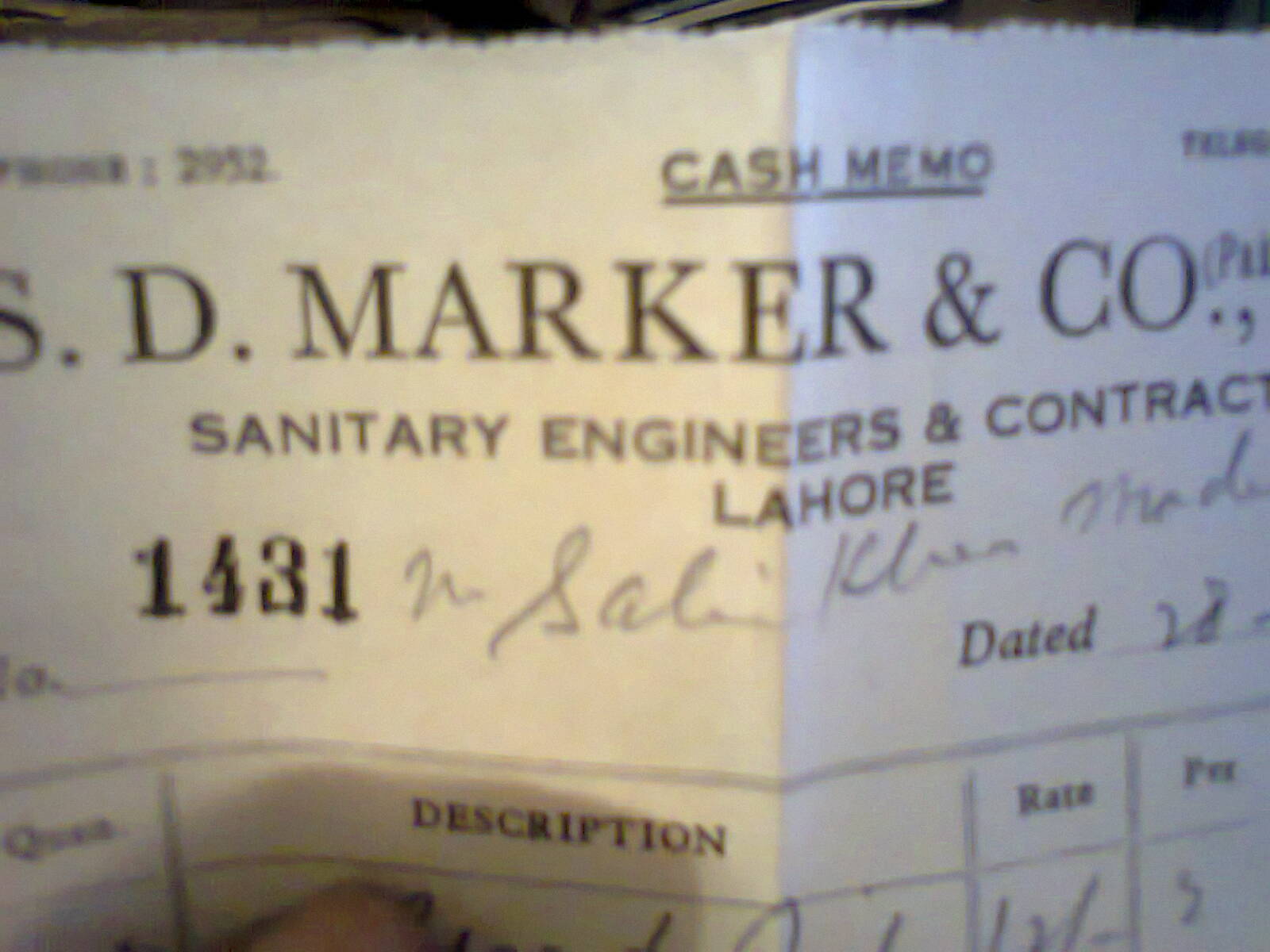 Image title: Images from The Sophia Institute - Cash memo SD Marker & Co, Lahore, 1948