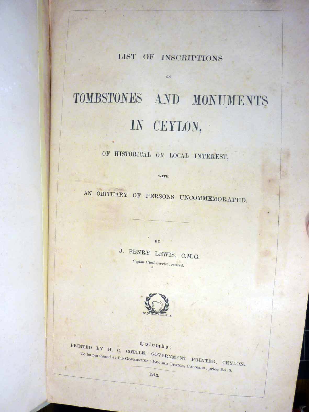 Image title: Tombstones and Monuments in Ceylon by J. Penry Lewis, C.M.G. images - i_Title_Page.jpg File size: 91,861 bytes |