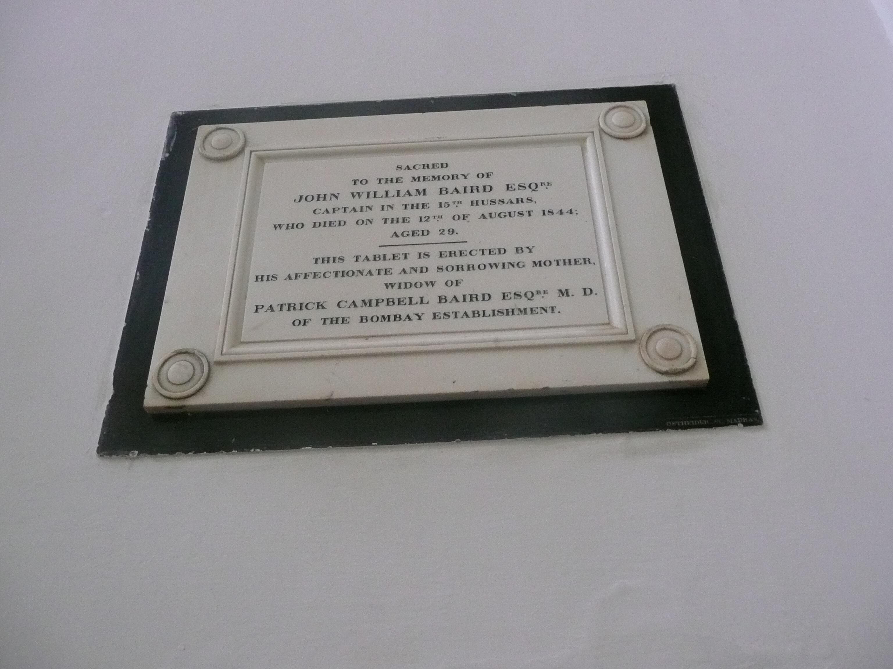 John William Baird, Memorial St Marks Cathedral Bangalore