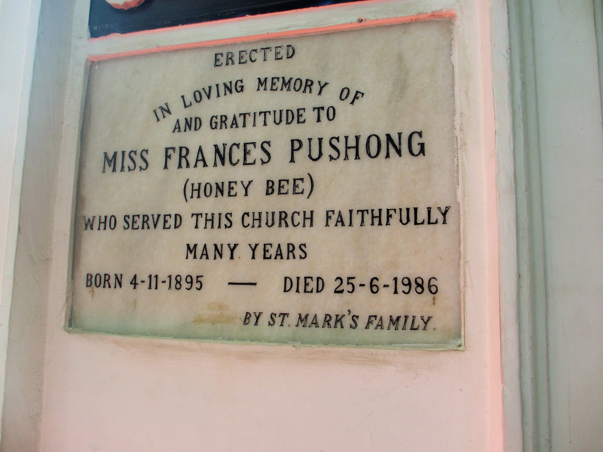 Miss Frances Pushong, Memorial St Marks Cathedral Bangalore