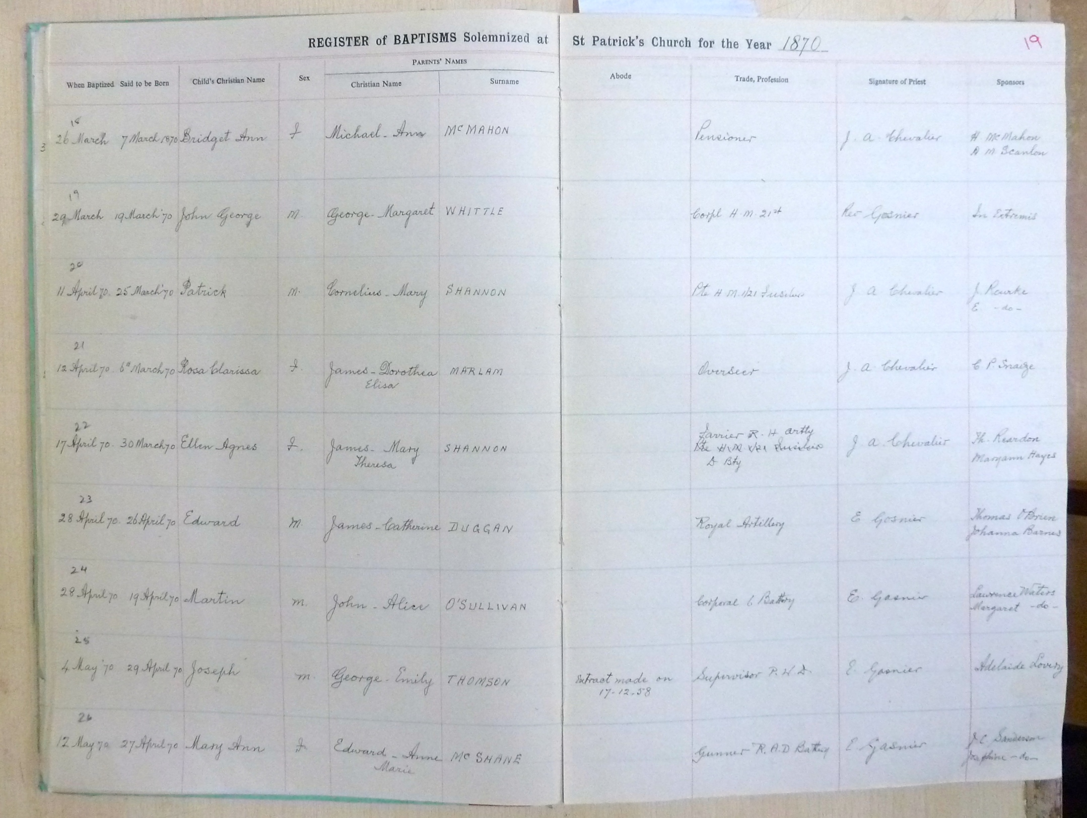 Image title: St Patricks Church, Bangalore Register of Baptisms 1868 to 1898 - page 19