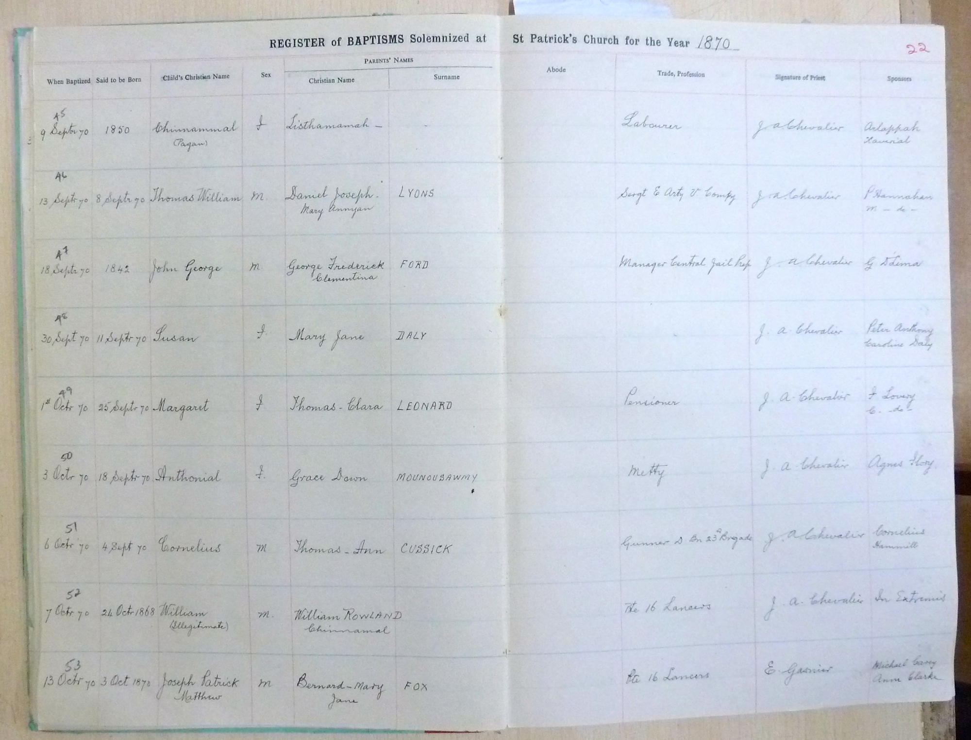 Image title: St Patricks Church, Bangalore Register of Baptisms 1868 to 1898 - page 22 File size: 885,270 bytes