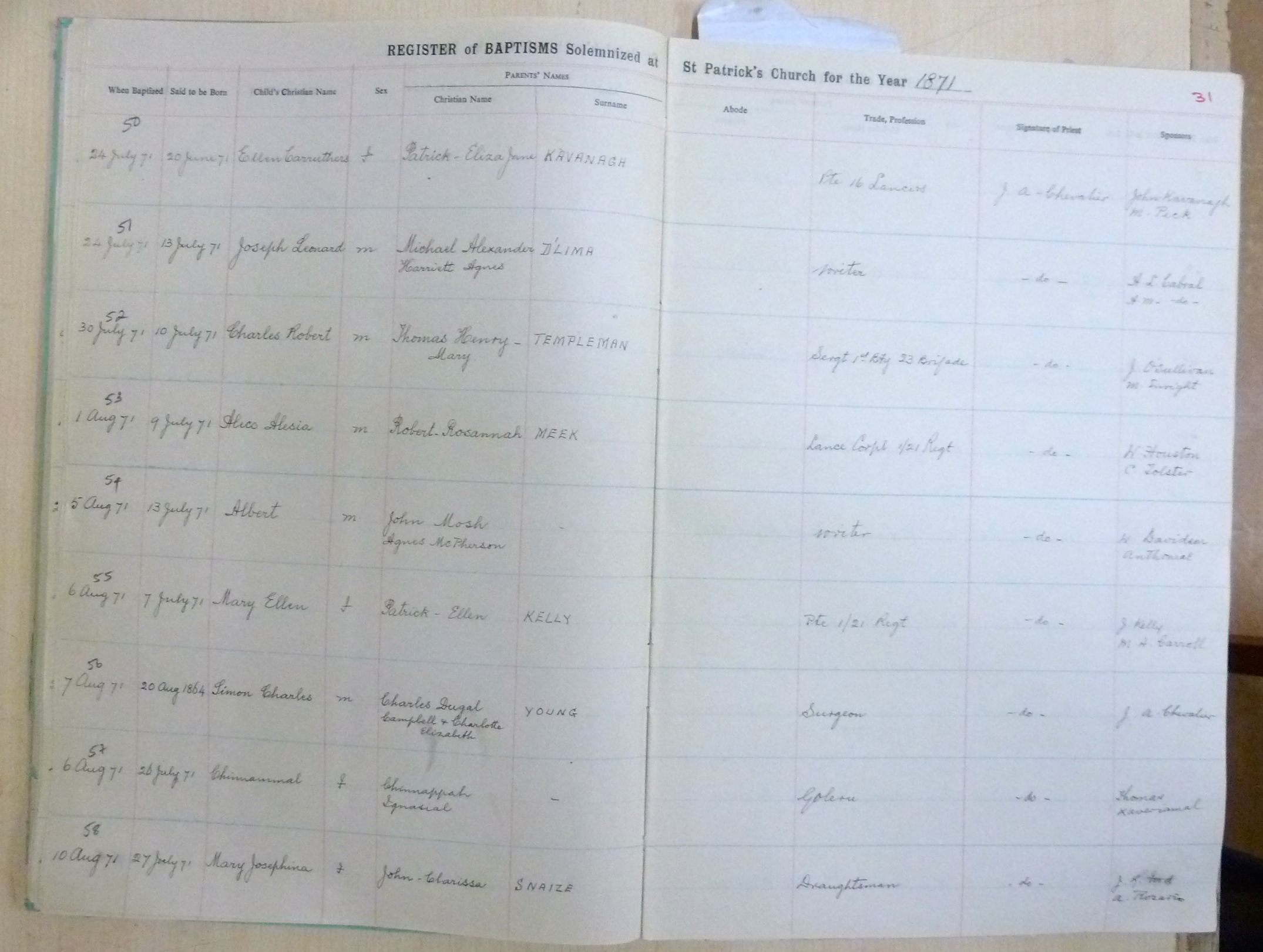 Image title: St Patricks Church, Bangalore Register of Baptisms 1868 to 1898 - page 31 File size: 882,536 bytes