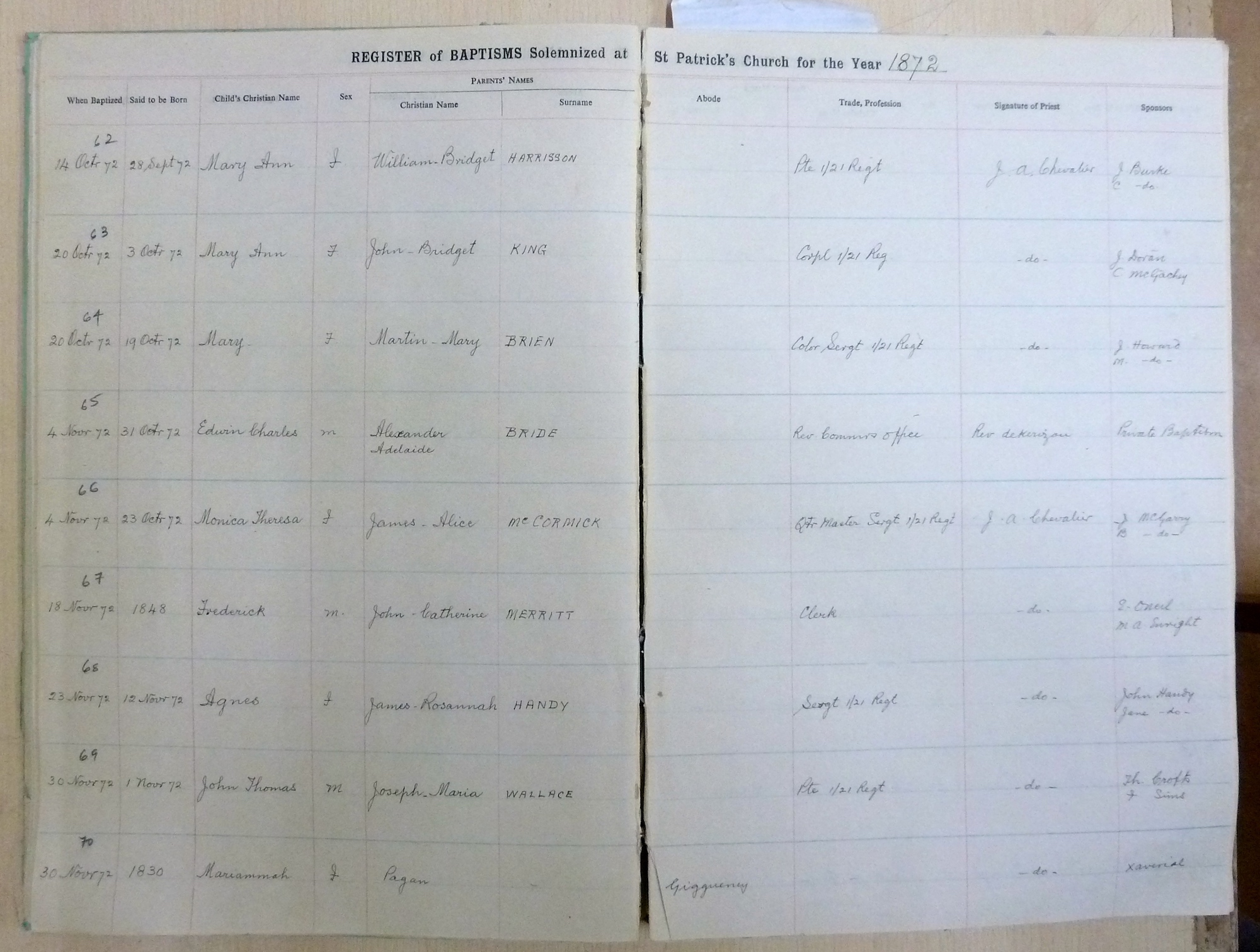 Image title: St Patricks Church, Bangalore Register of Baptisms 1868 to 1898 - page 43a File size: 897,029 bytes