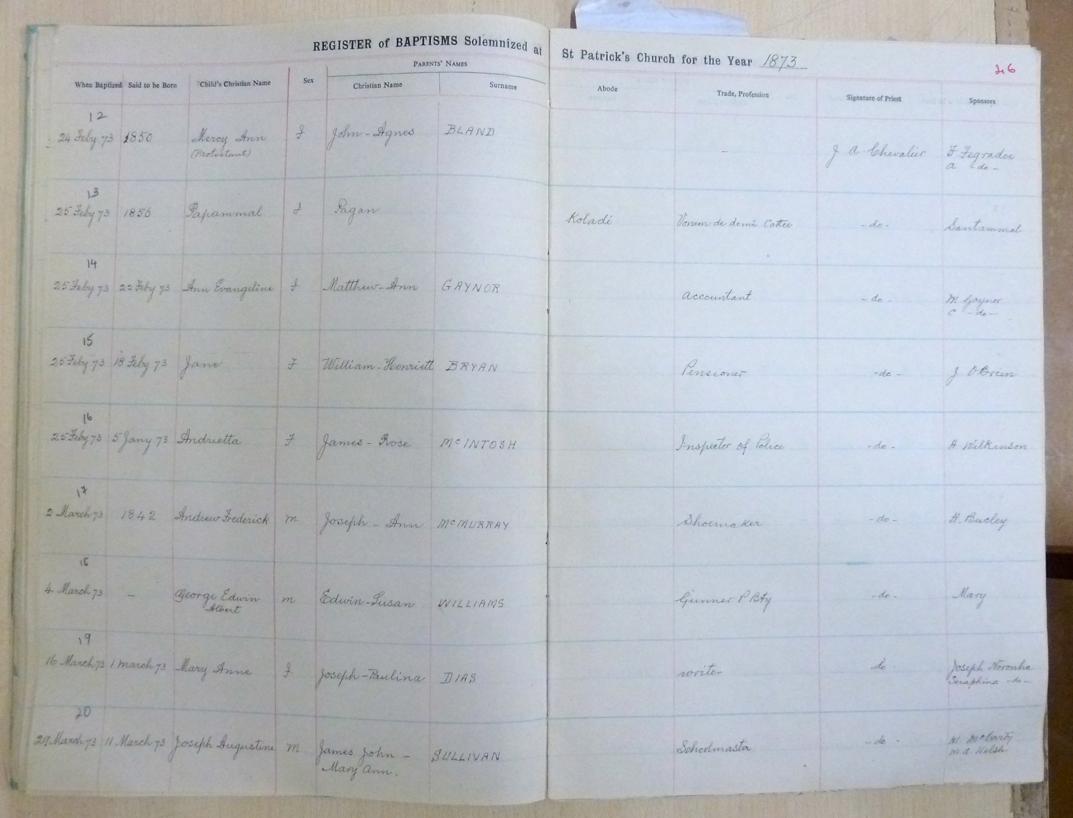 Image title: St Patricks Church, Bangalore Register of Baptisms 1868 to 1898 - page 46 File size: 911,609 bytes