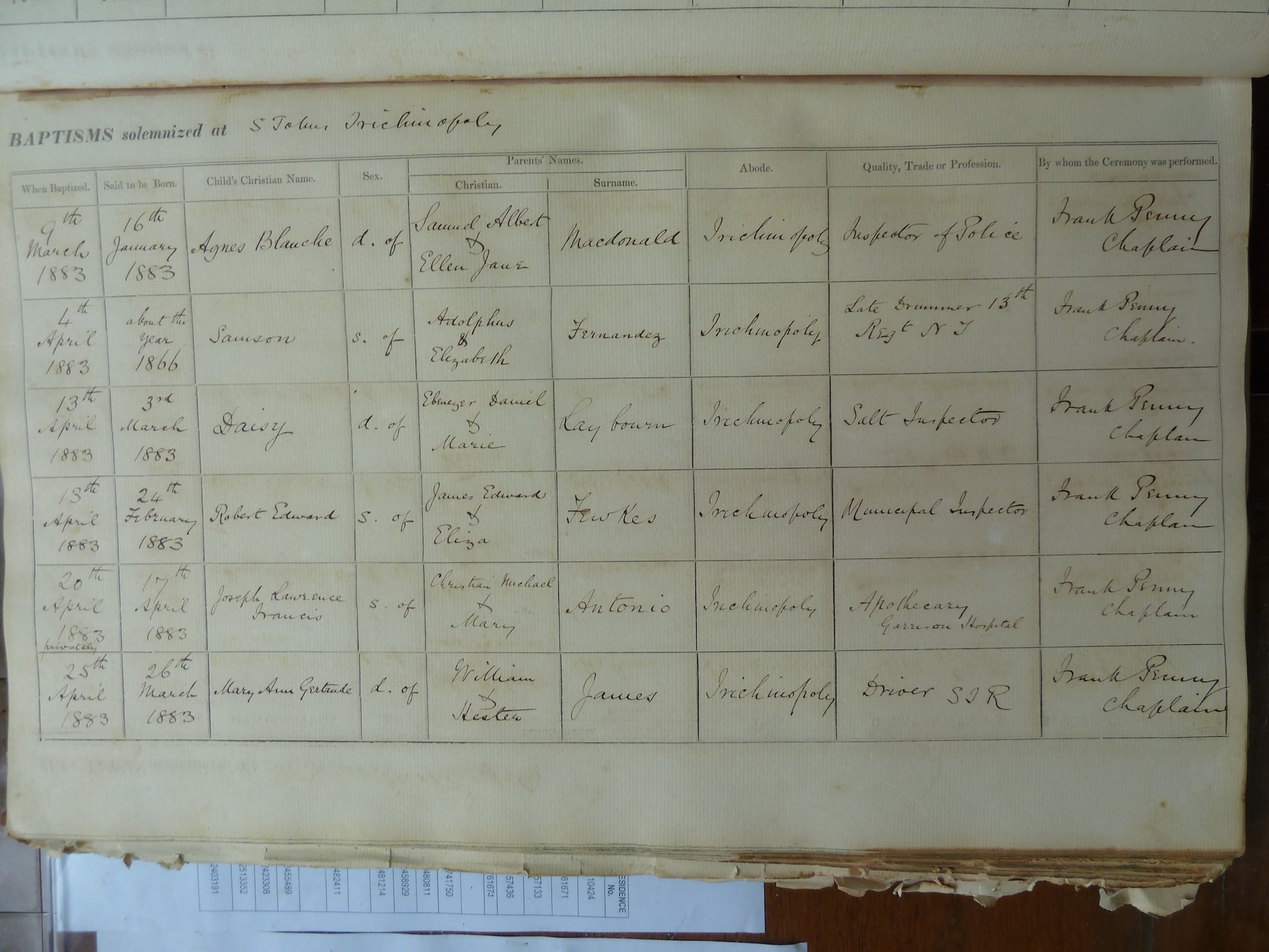 St Johns Church Trichinopoly - Baptismal Registers
